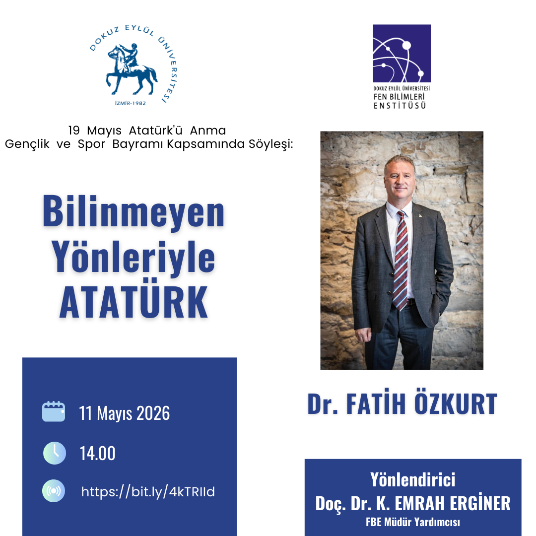| Fen Bilimleri Enstitüsü | Doç.Dr. Kadir Emrah ERGİNER | Dr. Fatih ÖZKURT | Bilinmeyen Yönleriyle ATATÜRK | 11.05.2026 | 14:00 | https://zoom.us/j/95582180392?pwd=Hp9uY84eaa0iGiLOMmLXdXCtGYCbJz.1