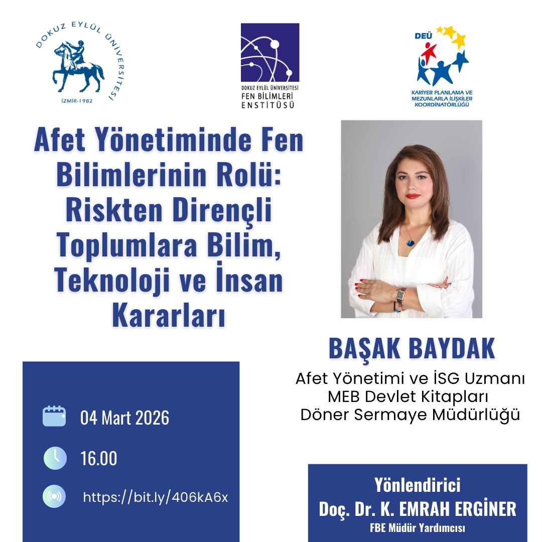 Afet Yönetiminde Fen Bilimlerinin Rolü: Riskten Dirençli Toplumlara Bilim, Teknoloji ve İnsan Kararları | 04.03.2026 | 16:00 | https://zoom.us/j/96154960636?pwd=cvHhpFaibjvX5knlaUy0XYVaGMwA5P.1